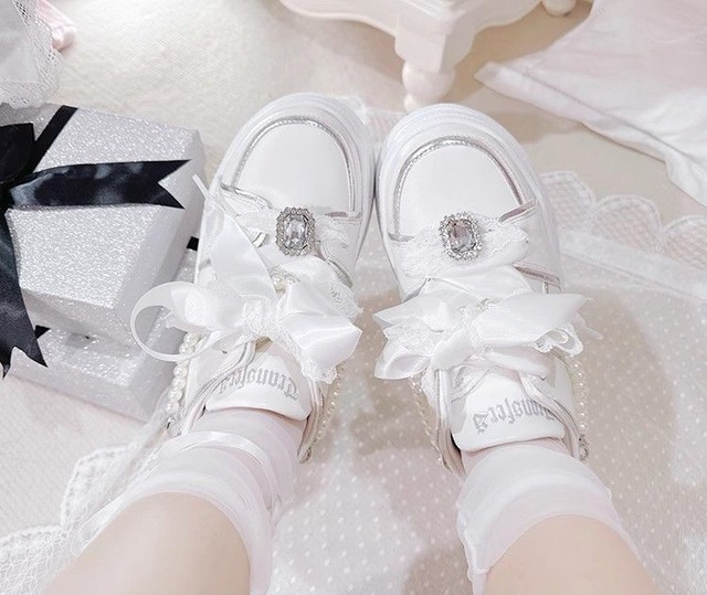 レースリボンとパール装飾のロリータスニーカー - 甘くてレディライクなスタイル