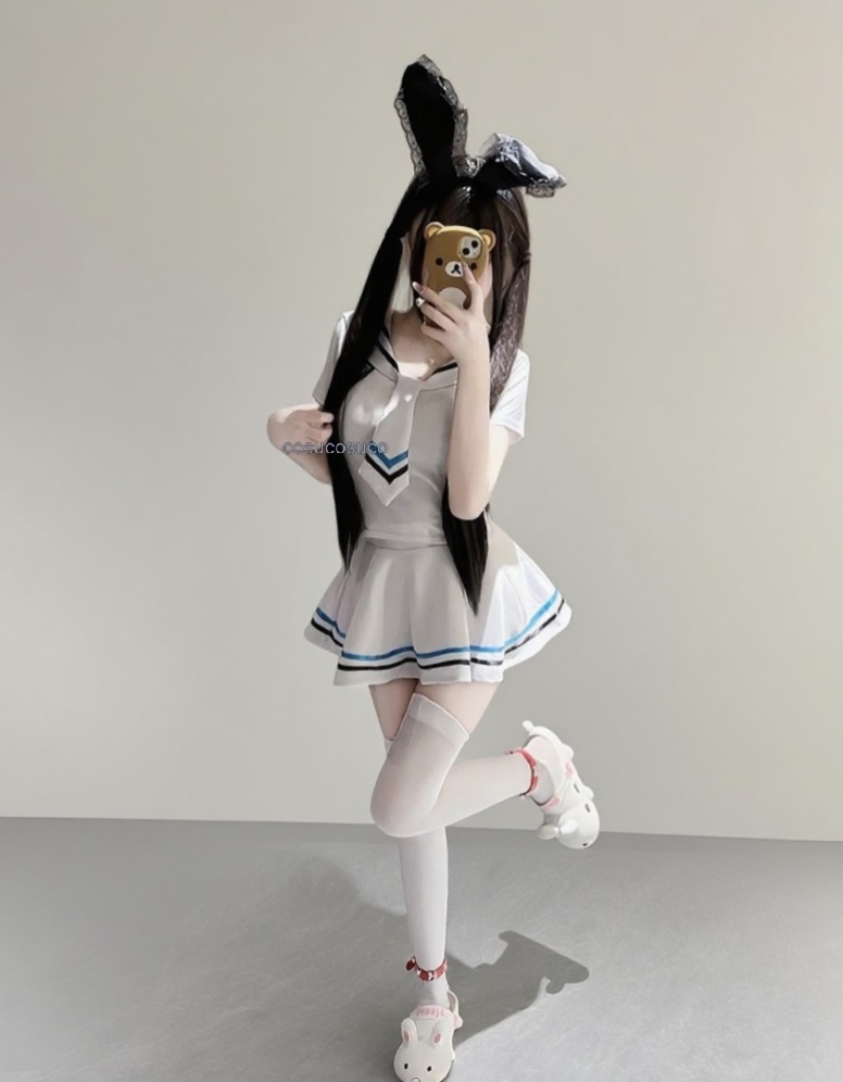 今回の水手服は、真っ白な上衣がポイント。柔らかなコットン素材で、肌触りも軽やか。ネイビーとブラックの海軍風セーラーカラーが、ぐっと雰囲気を引き締めてくれます。胸元には小さな校章の刺繍があって、細部までこだわりが感じられる仕上がり。本当に日本の学園に通っているみたいな気分になれます。