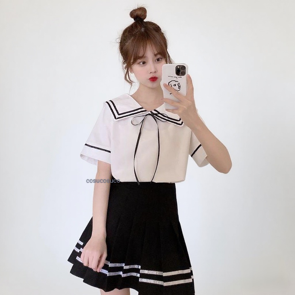 今日はクローゼットを開けたとき、ふと目に入ったお気に入りの一着——白いシャツのセーラーカラーに黒いリボン、まるで漫画のコマから抜け出してきたような清楚さ。黒いスカートに走る白いラインは、きりっとしながらもどこか愛らしく、自然と背筋を伸ばして歩きたくなる。