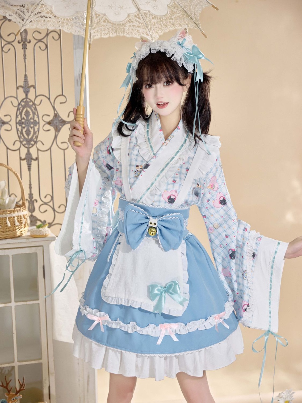 ロリータの繊細さを骨に、メイド服の愛らしさを魂に、浴衣の軽やかさを翼にして。ピンクとブルーの2色展開で、さまざまな乙女心に寄り添います