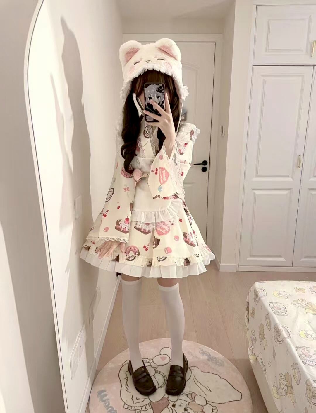 エプロンデザイン+くまさんケーキ柄で、まるで“スイーツショップの小さなメイド”に早変わり。