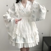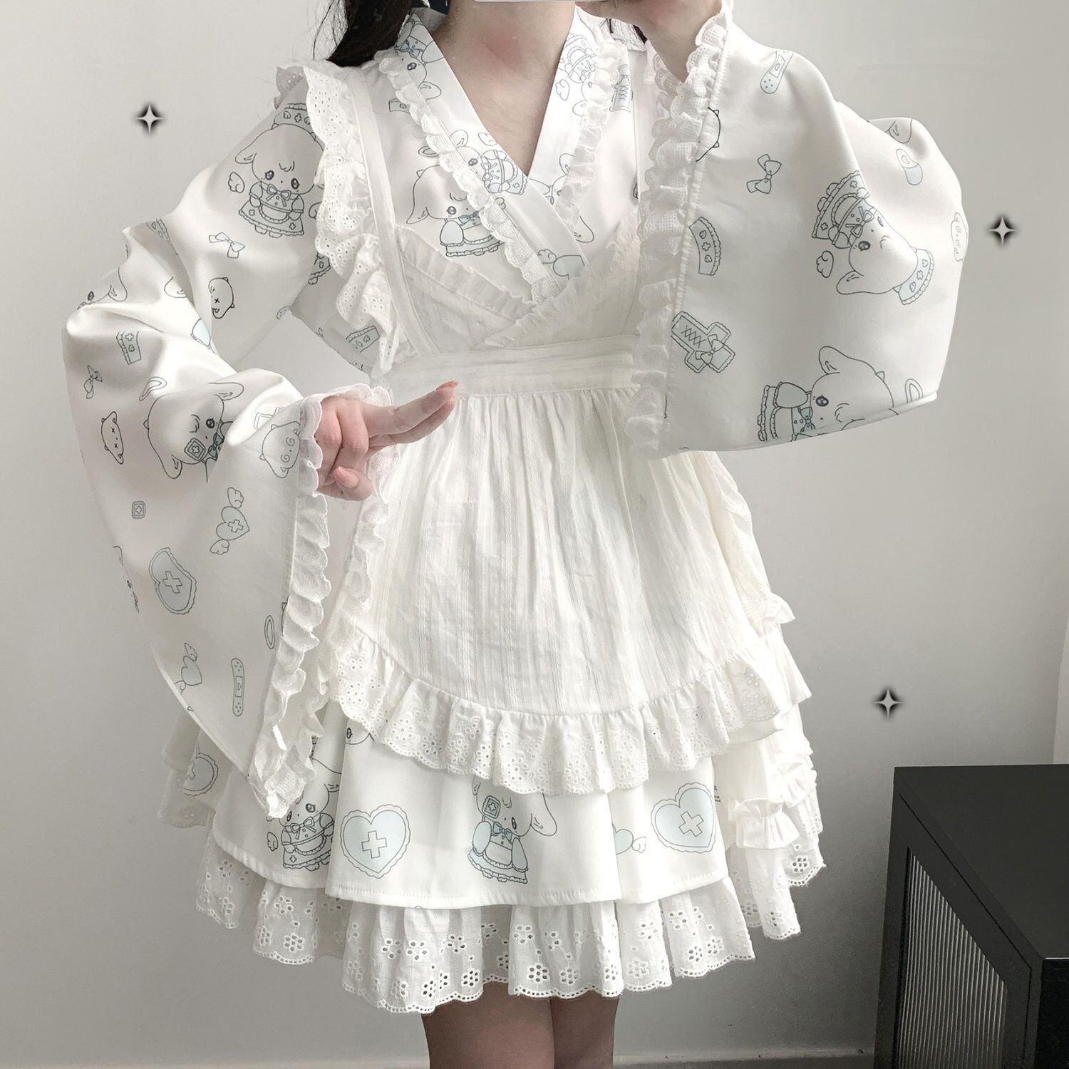 全面にプリントされたキュートな柄+やさしいホワイトトーン!お茶会で主役になるときも、おうちで美少女を目指すときも、これを着れば可愛さがあふれて、空気までふわふわ~~泡が弾けそう。