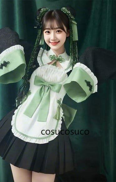 爽やかなグリーン×ホワイトの配色で、パッと華やかに。襟元のチャイナボタン風デザインと大きなグリーンのリボンが、愛らしさと個性を演出します。袖口やエプロンの縁には繊細なレースが施され、細部までこだわった甘い雰囲気に。黒のプリーツスカートが元気でアクティブな印象をプラス。