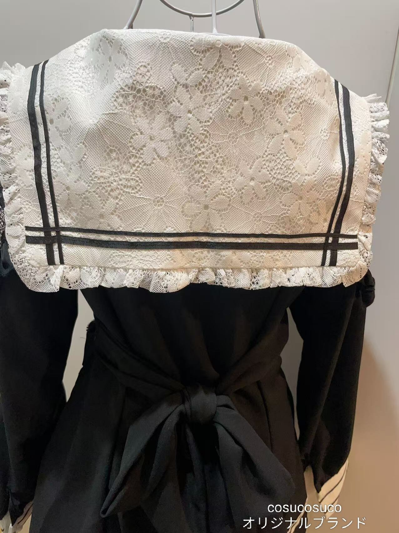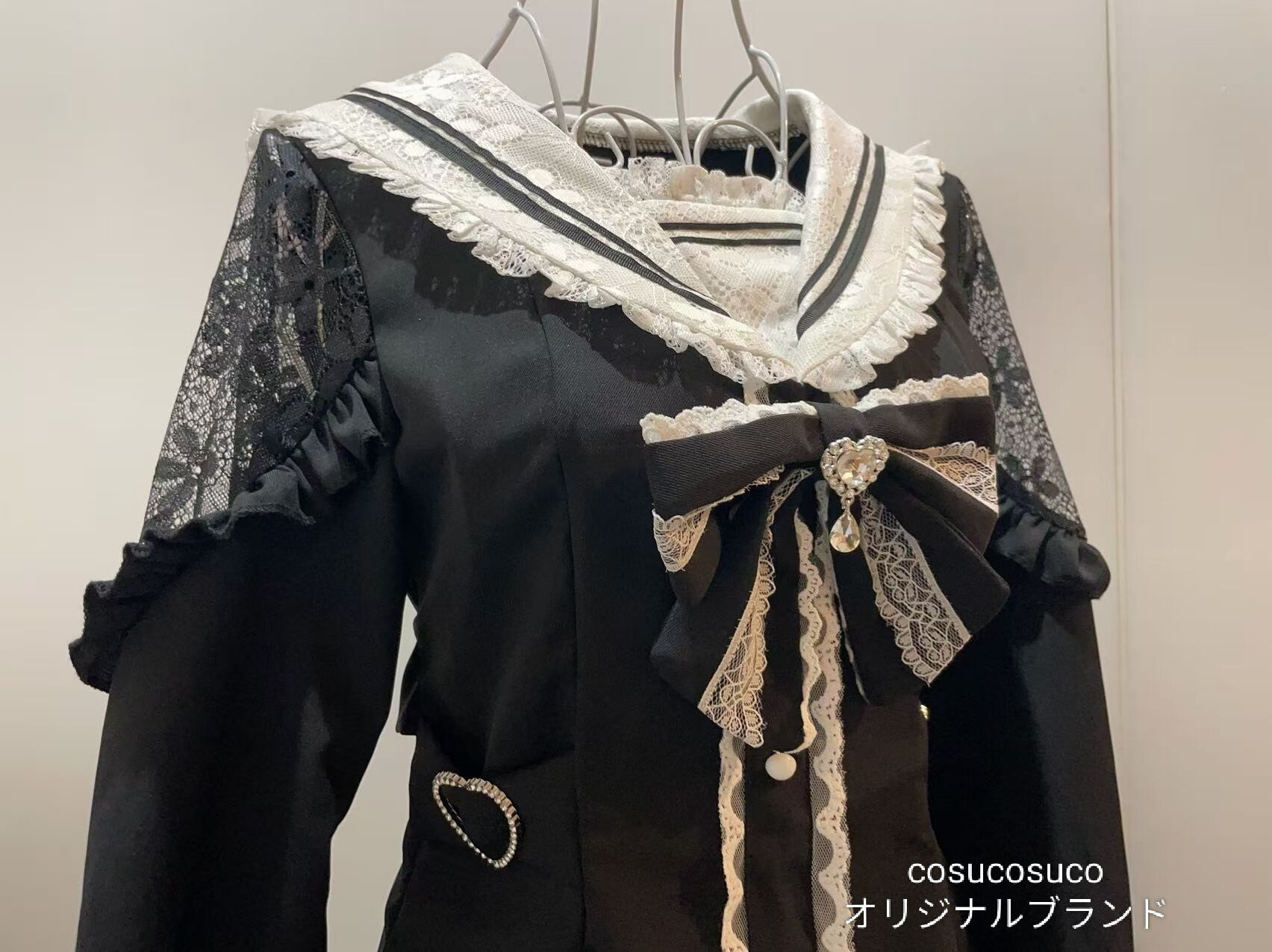 繊細な白いレースの襟と袖口に、大きなリボンが甘さとクールさを両立しています。