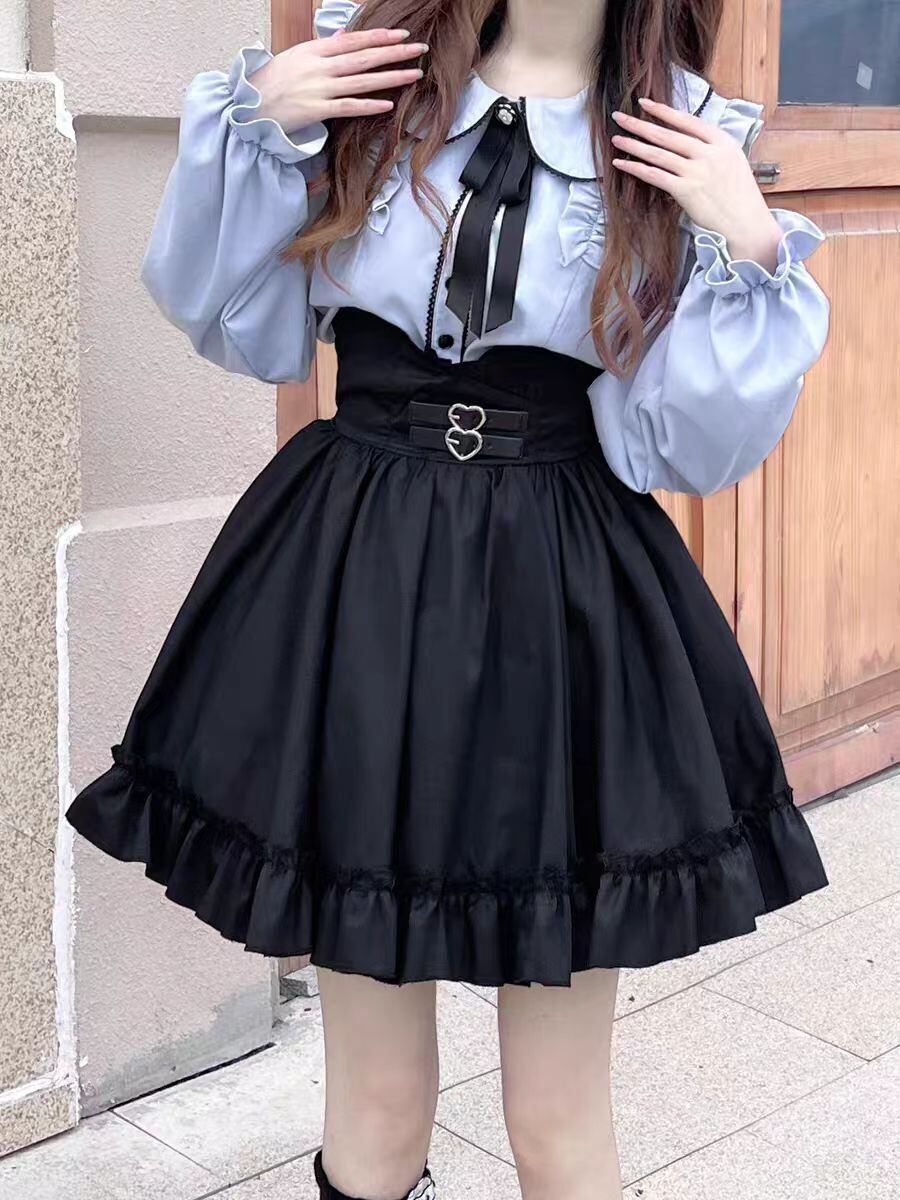 フリル+ブラックリボンの組み合わせがガーリー感たっぷり、ハイウエストのふんわりスカートはウエストをキュッと細く見せてくれます。