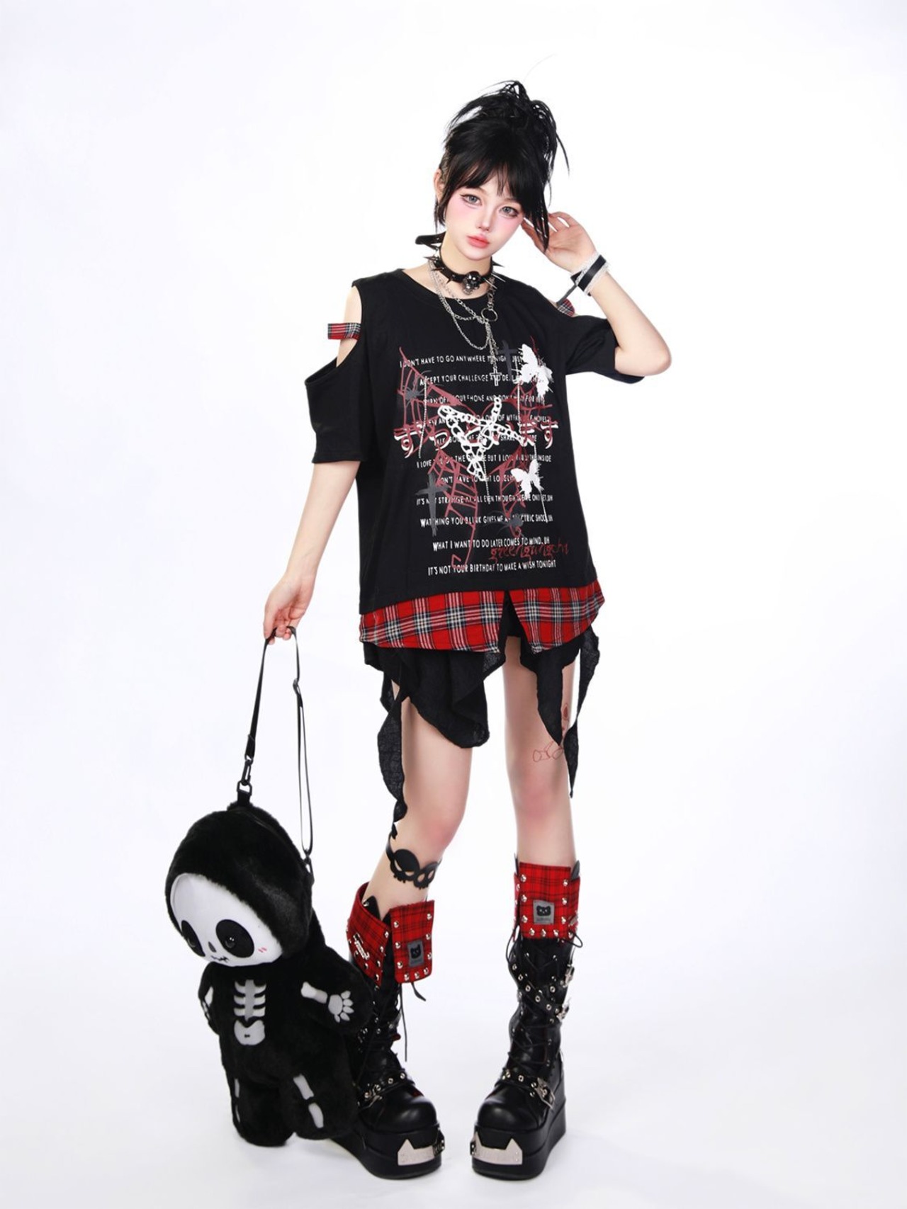 このTシャツは、サブカルチャー風のデザインが特徴。フロントにはゴシックな雰囲気のロゴがアクセントとして施され、ゆったりとしたオーバーサイズのシルエットが体型を美しく見せながらも、個性を際立たせます。ブラックカラーはクールさが際立ち、レッグウォーマーや厚底ブーツと合わせることで、独自のスタイルを簡単に作り出せます。自分だけのスタイルを楽しむための、必須アイテムです。