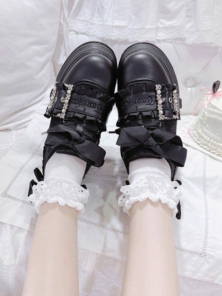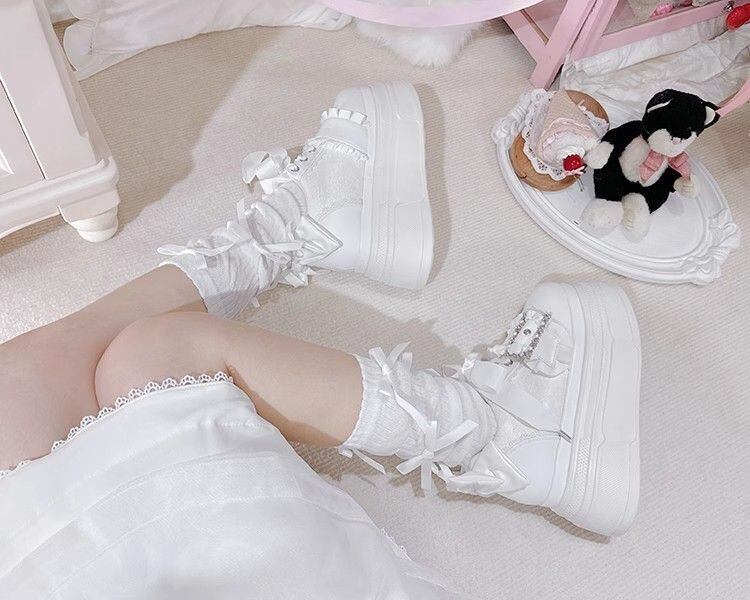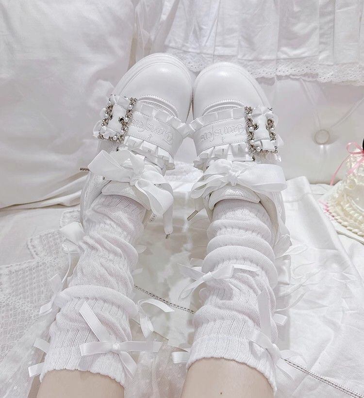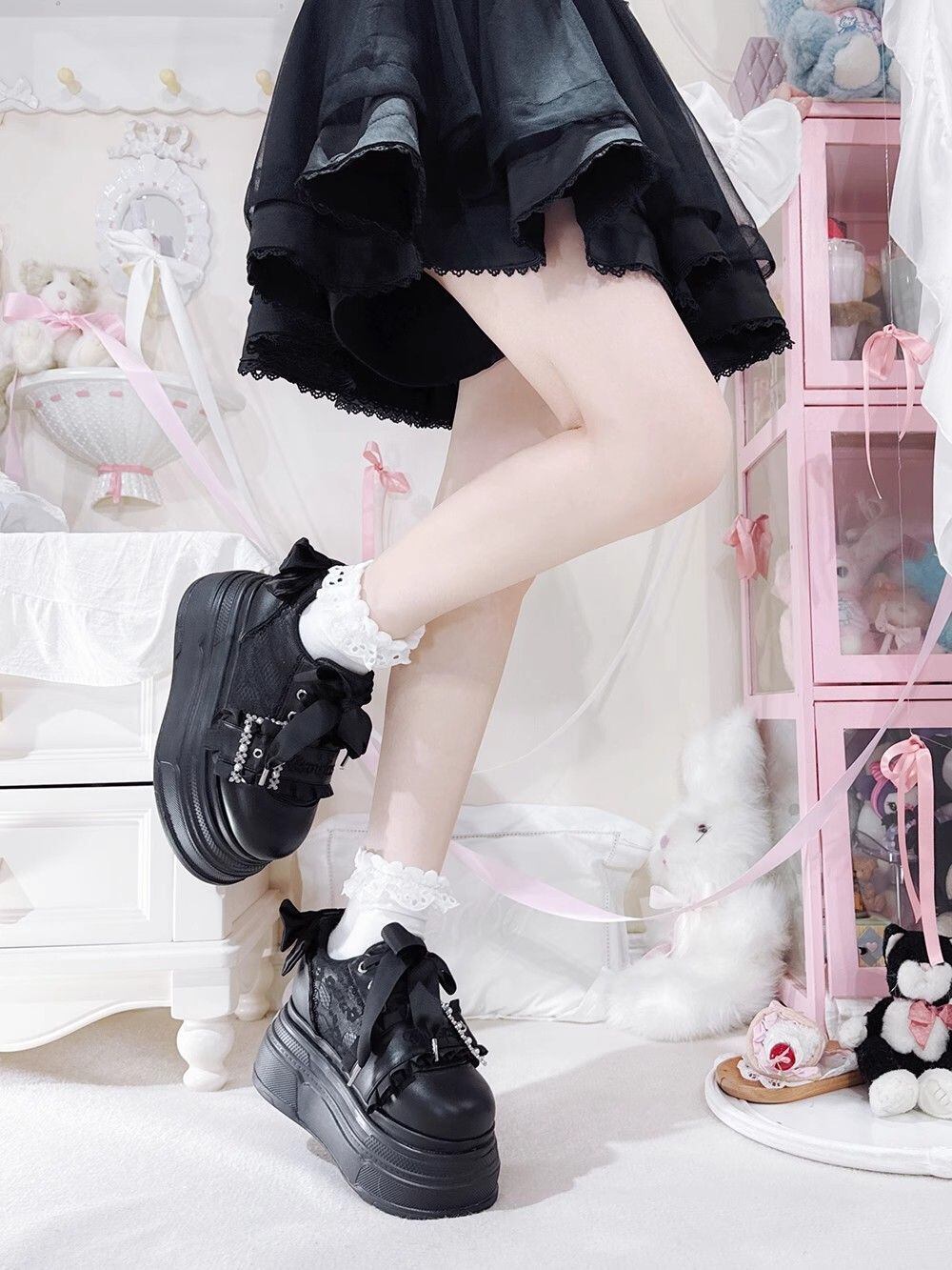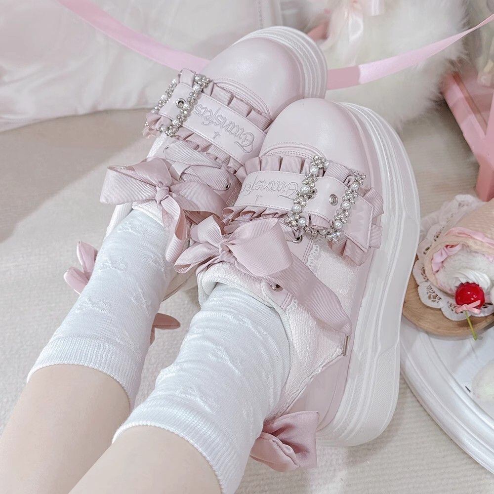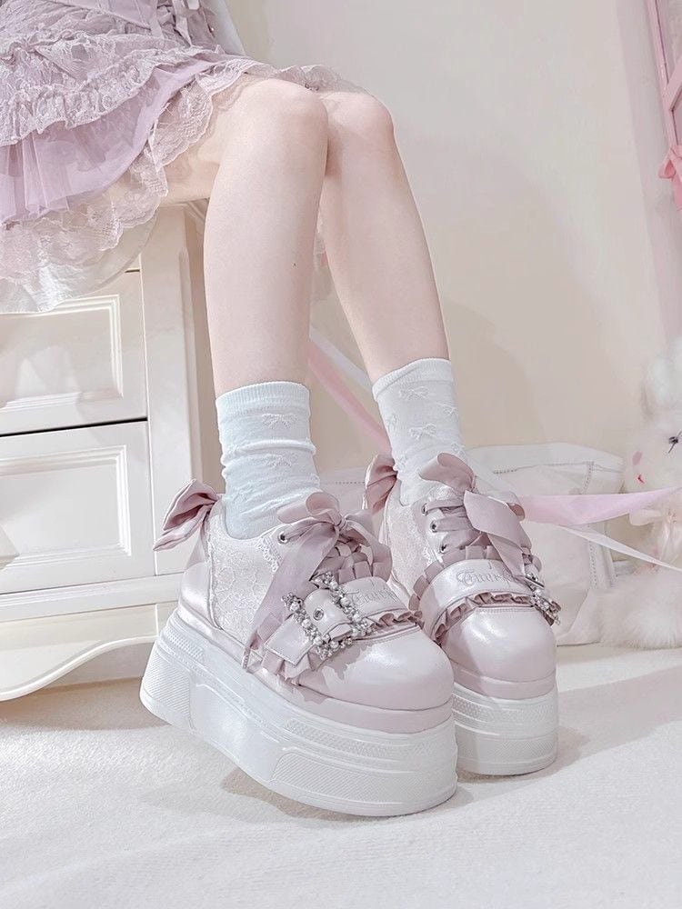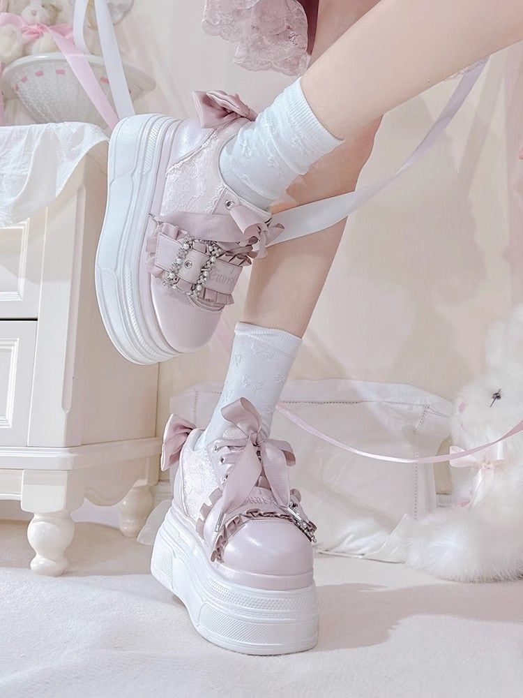 レースリボンとパール装飾のロリータスニーカー - 甘くてレディライクなスタイル