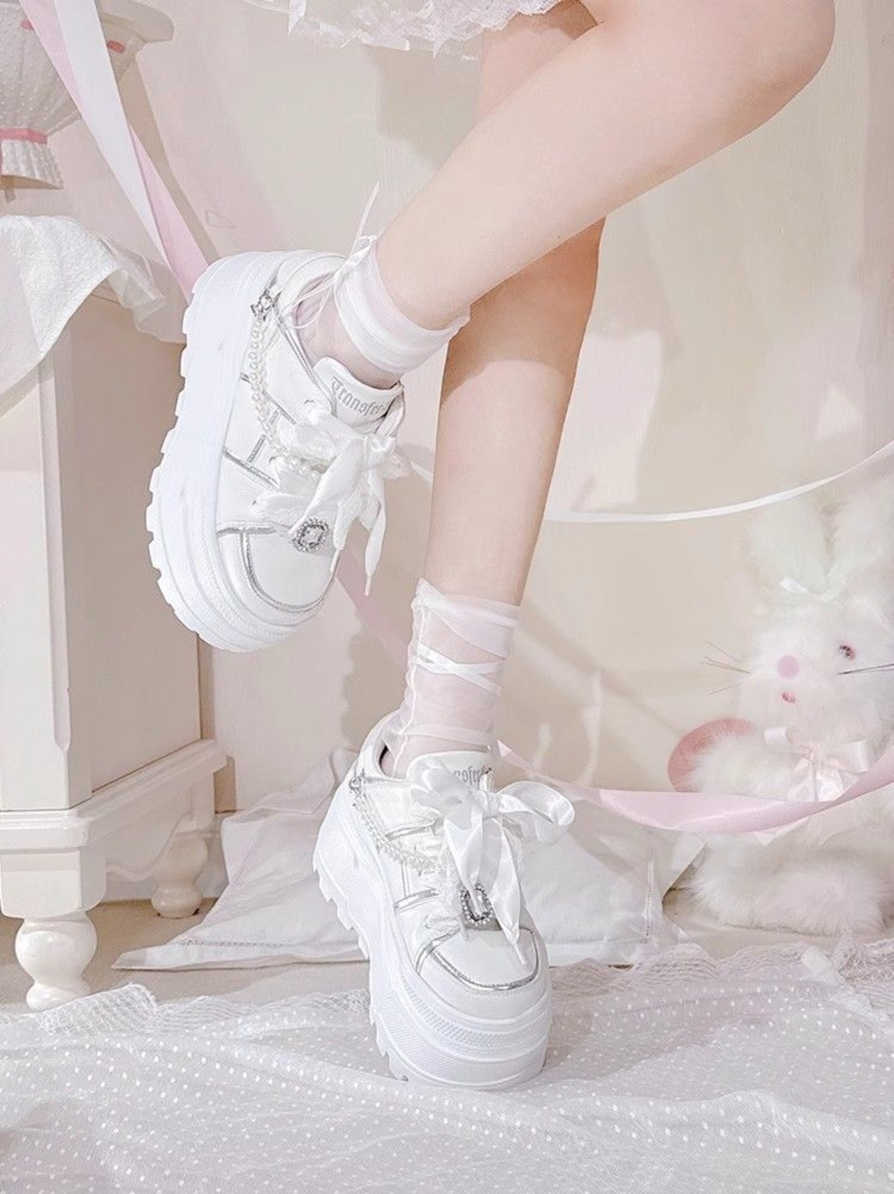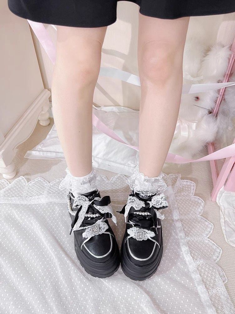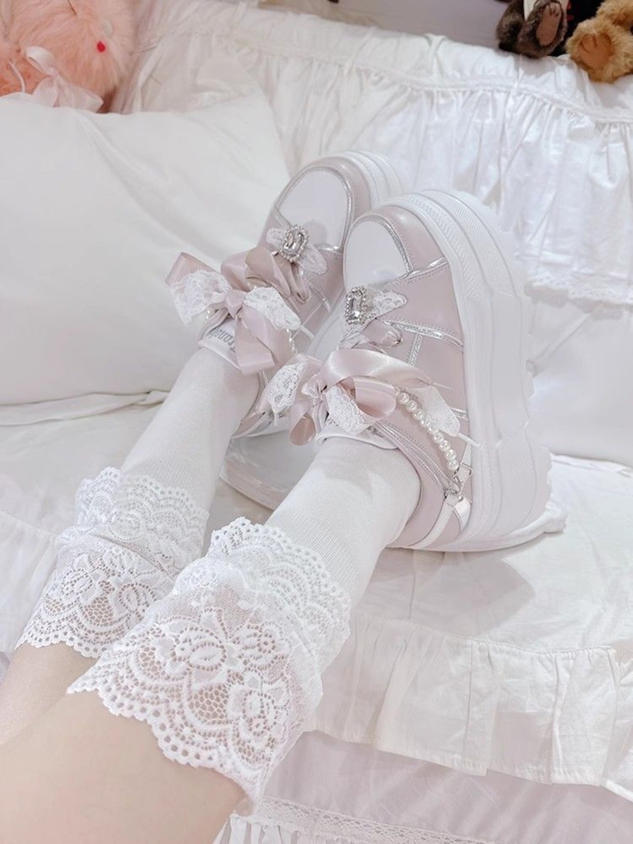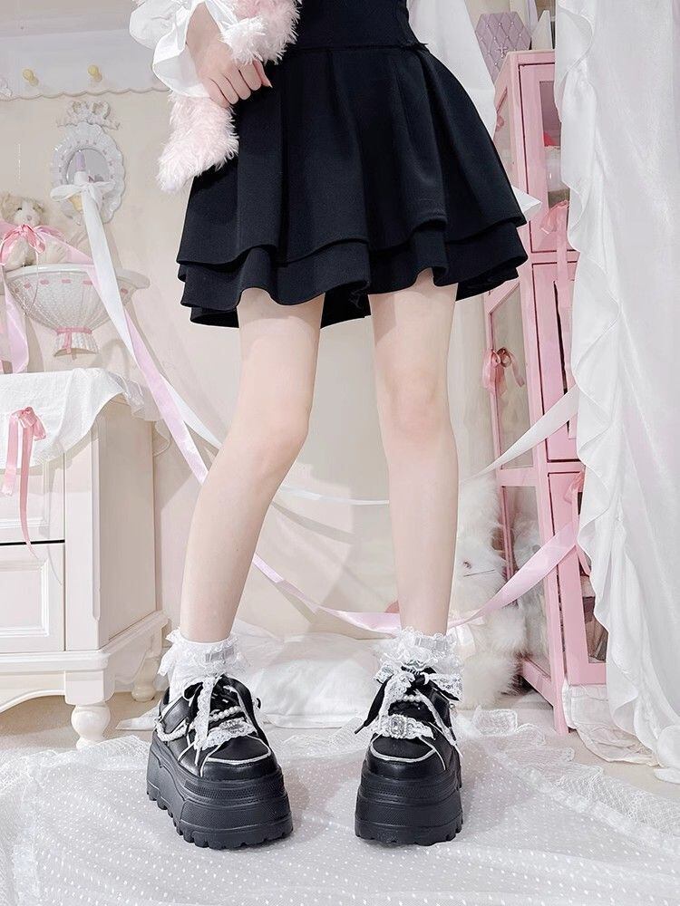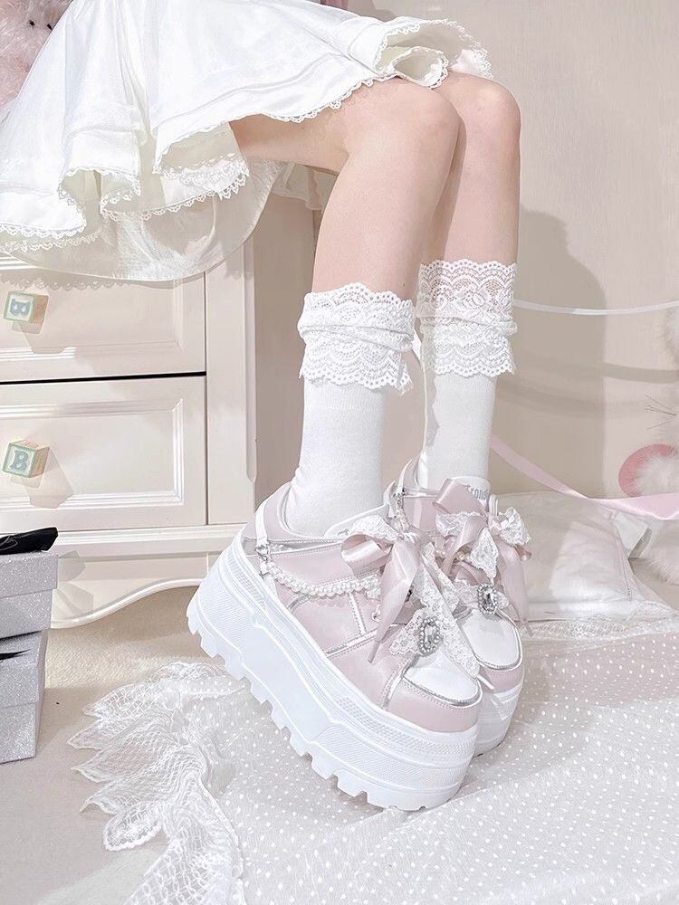 レースとリボンがクールで甘く、そしてレディライクなロリータ風プラットフォームスニーカー。