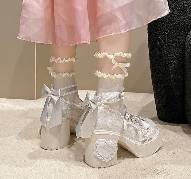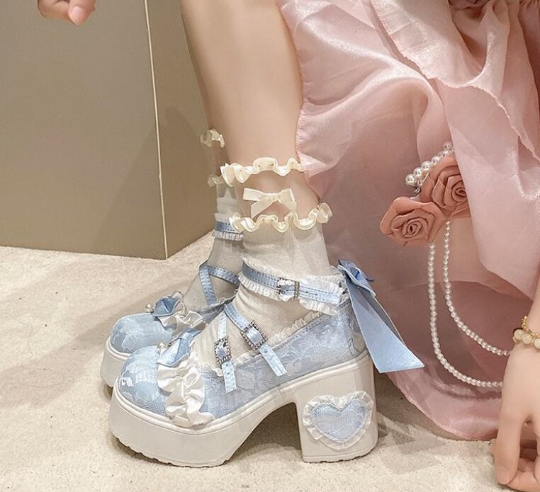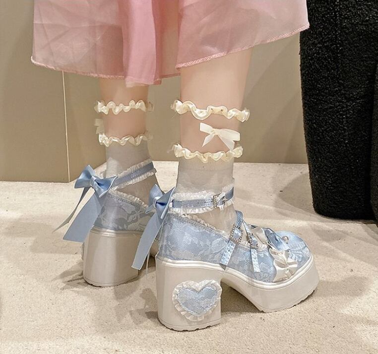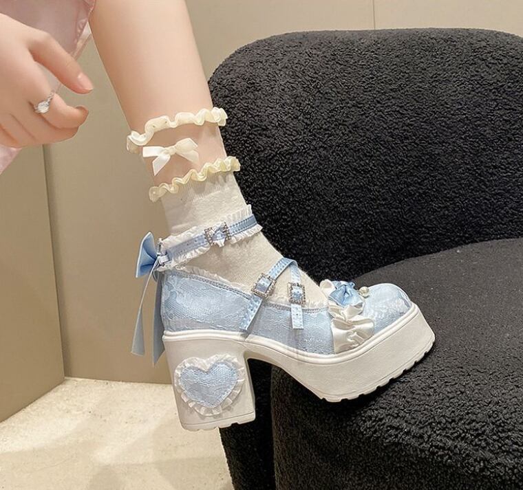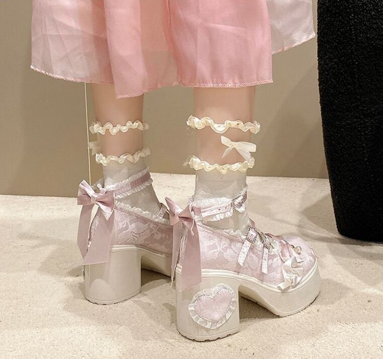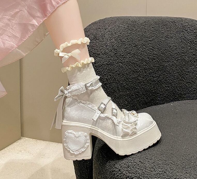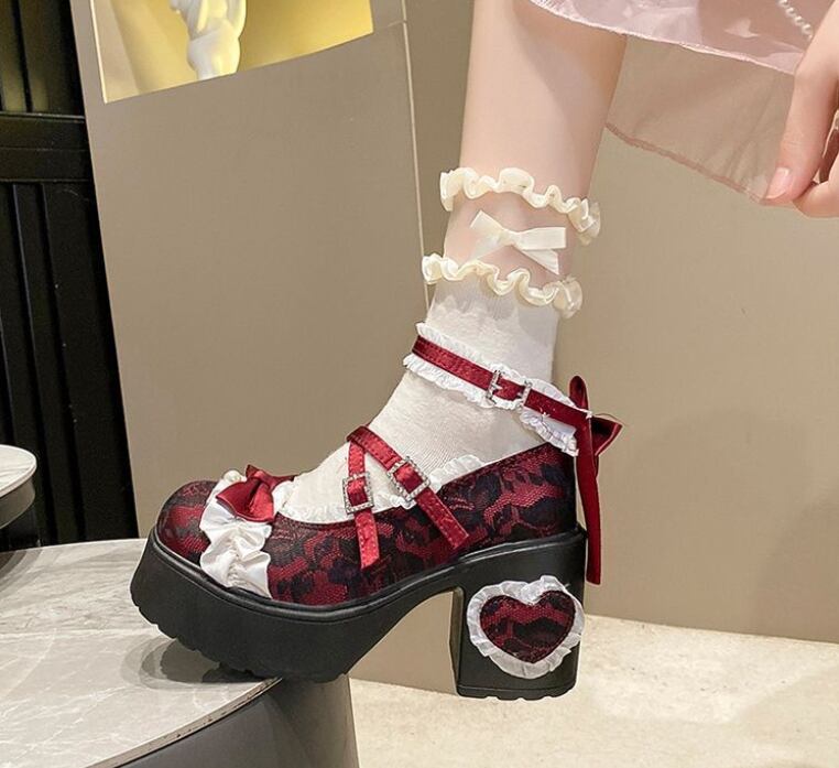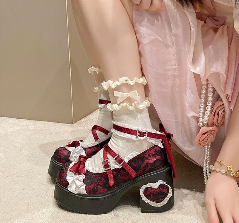 レースのアッパーとハート型のヒールが特徴 エレガントなロリータハイヒール。