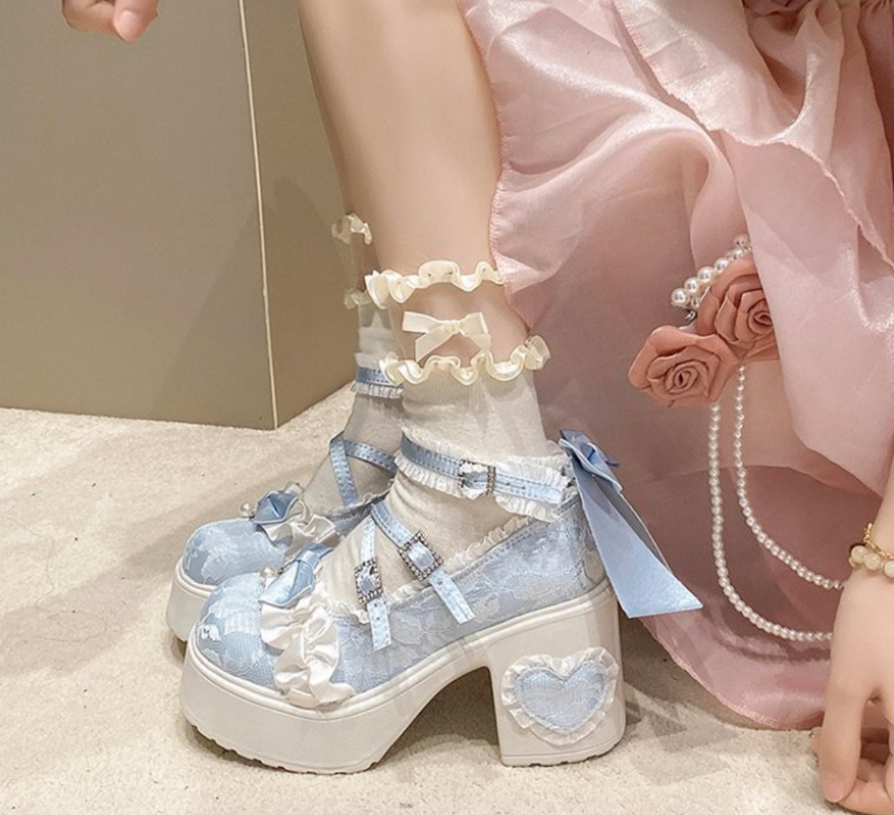✨ 重ねたリボン、フリル、パールをあしらったデザイン。個性的なハート型のヒールと、調節可能なアンクルストラップ付き。