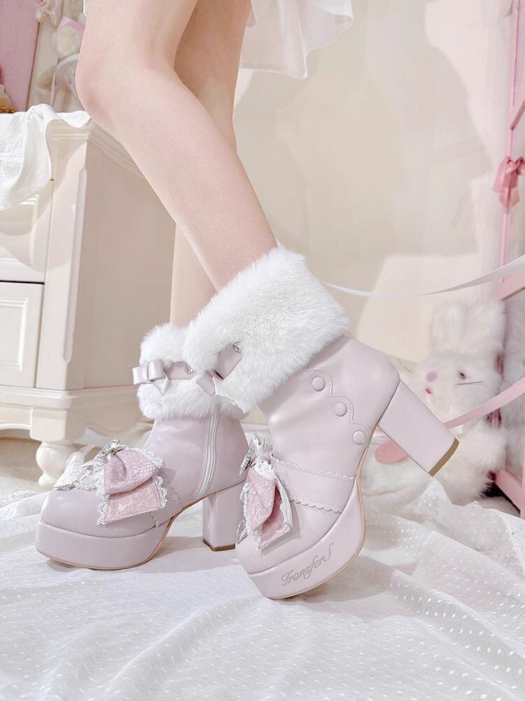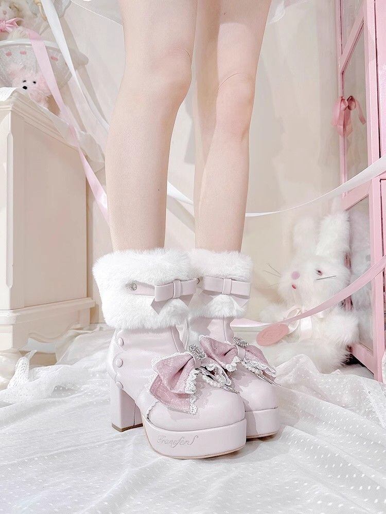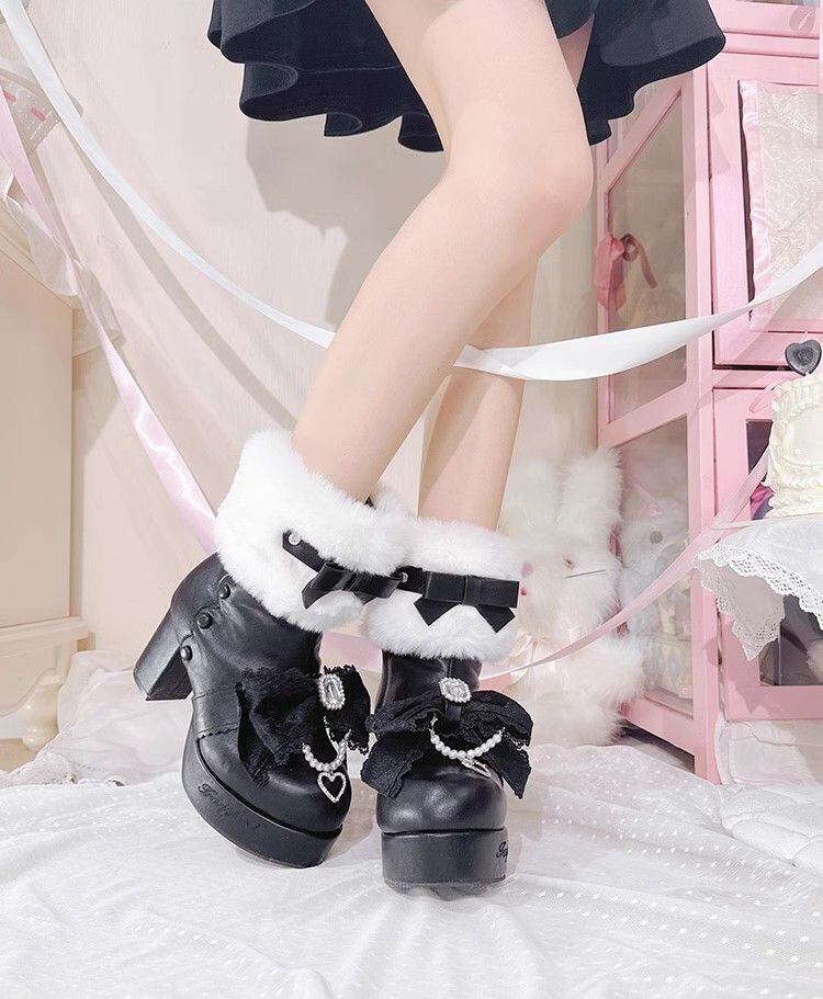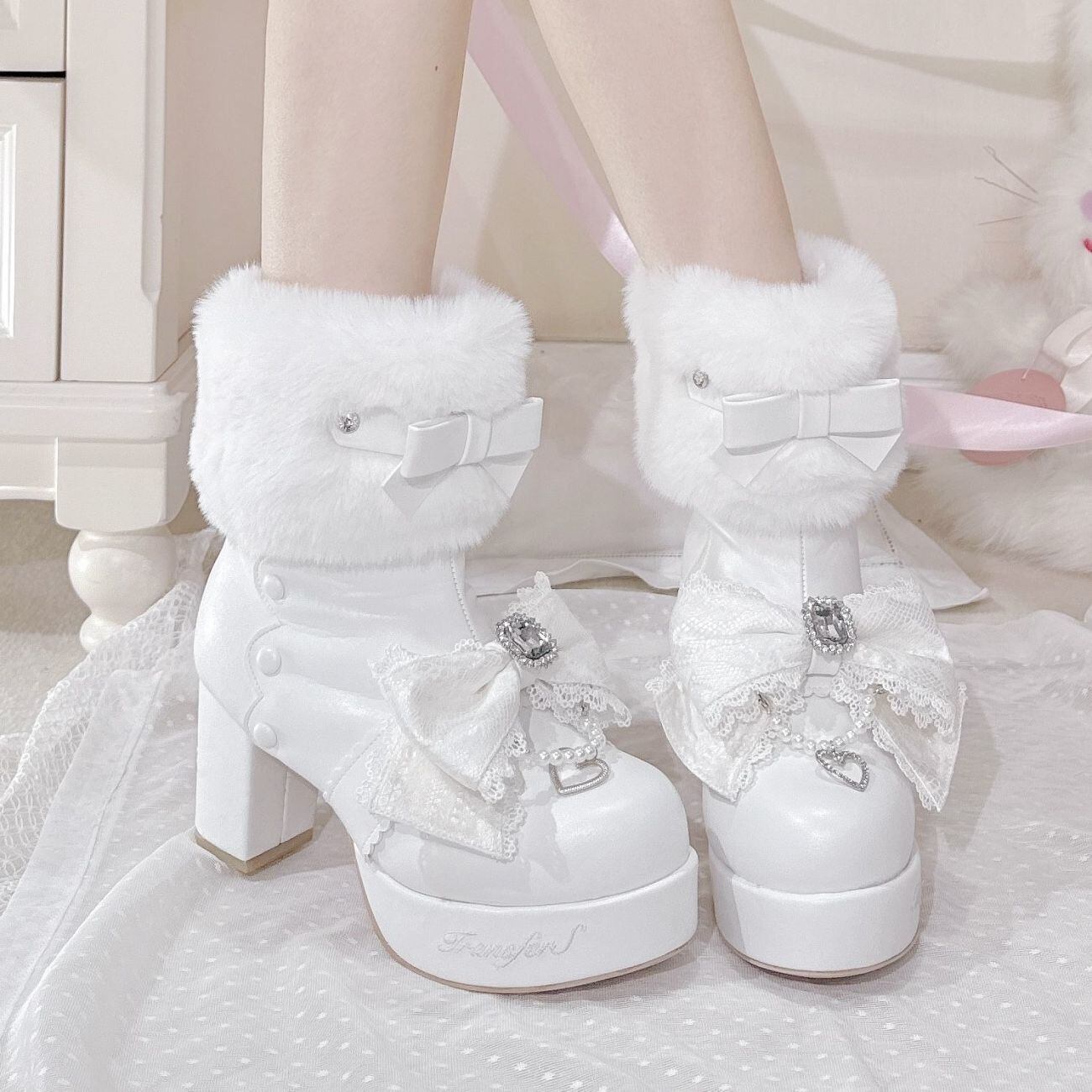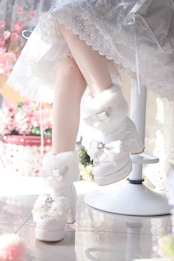 冬ロリータブーツ ホワイト、レースリボン、パール装飾