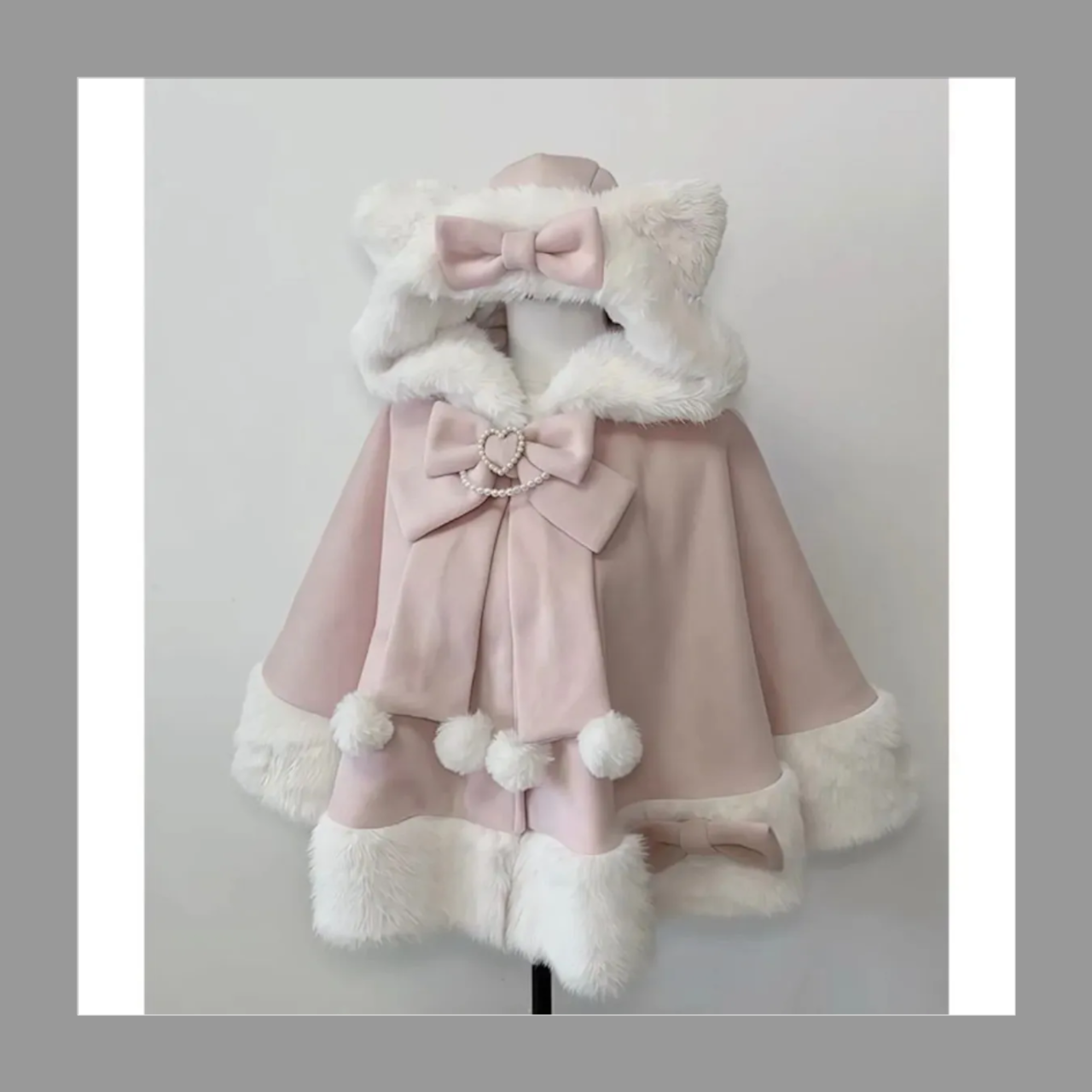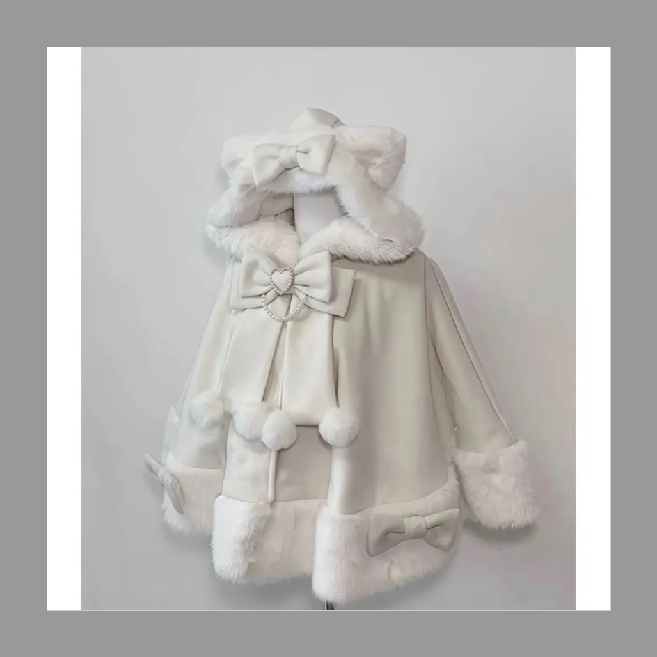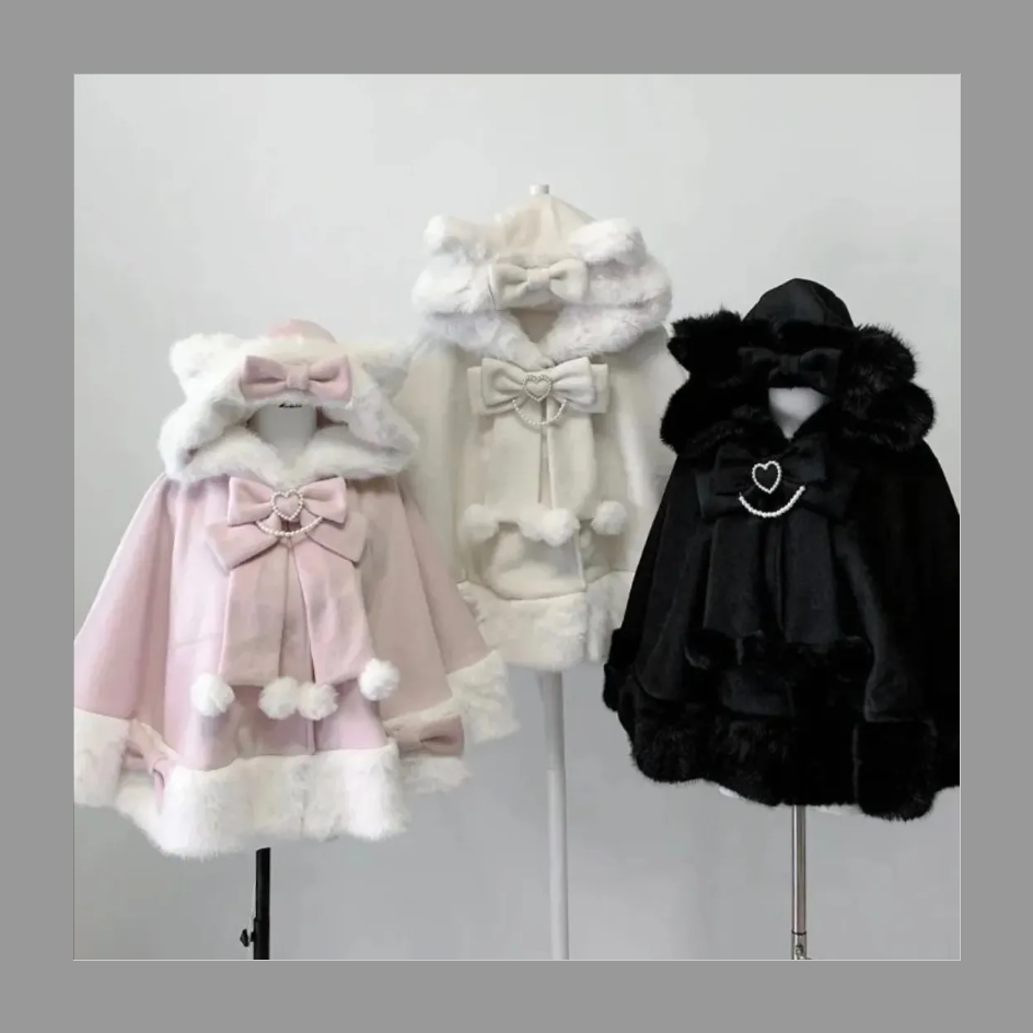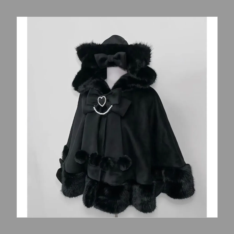猫耳ポンチョ Lolita ロリータ 地雷系コート ネコ耳 リボンハート ファーコート ケープコート ワンピース