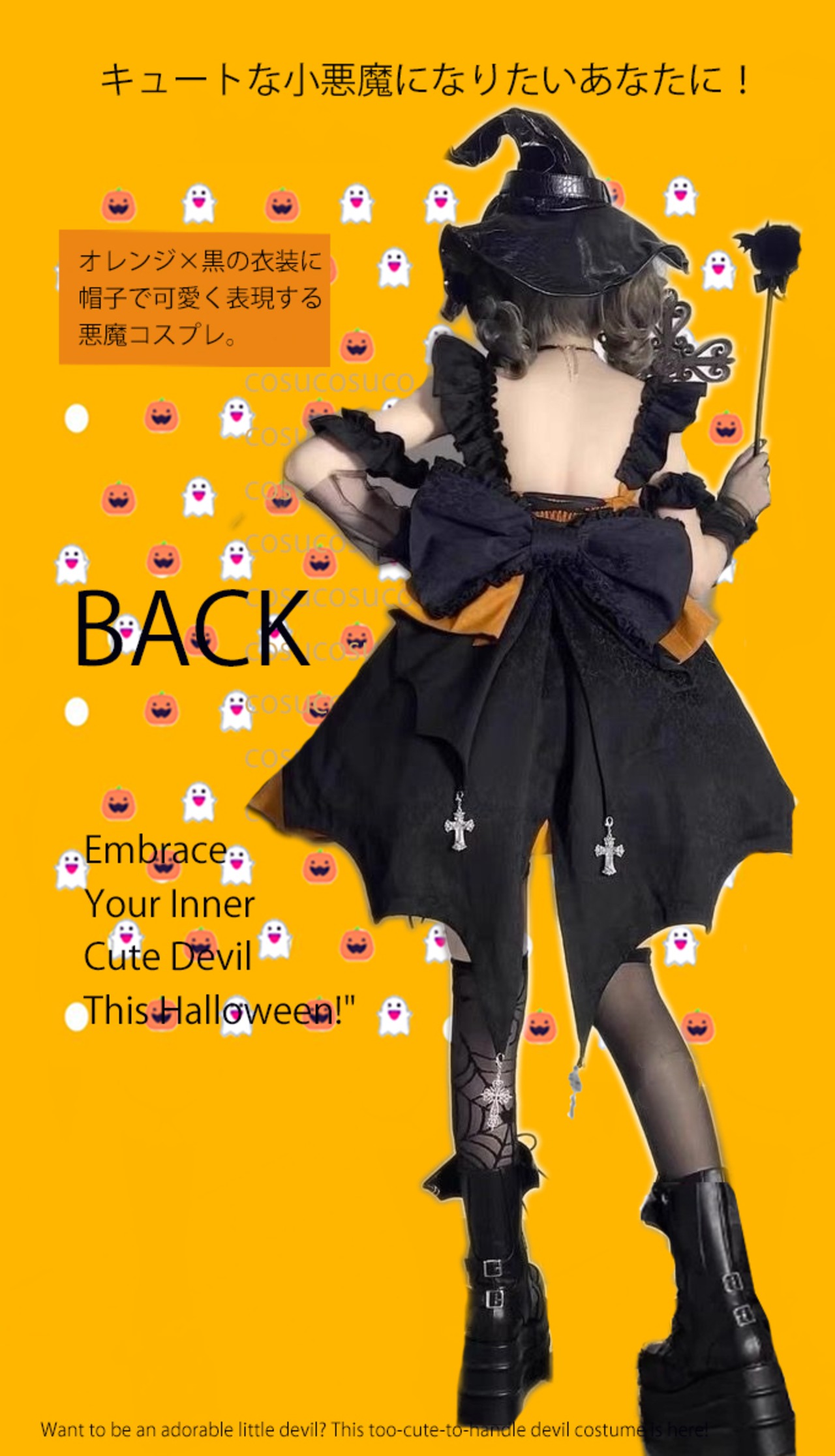 オレンジ×黒の衣装に帽子で可愛く表現する悪魔コスプレ。羽とリボンがアクセントとなり、さらに可愛さアップ♪